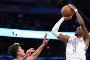 今天雷霆对魔术最后一节99比96胶着时,亚历山大一个单挑撤步三分,击倒班凯罗。