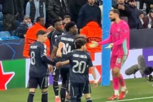 维尼修斯补时第一分钟破门后,对着球迷展示球衣。随后曼城门将多纳鲁马摊手与其沟通表达不满。