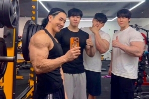 体育资讯4月19日讯 健身教练分享了和HLE三人组Kanavi、Zeka、Gumayusi的合照,并P了一张三人化身“健美先生”的照片。
