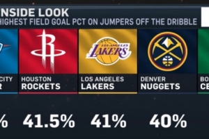 体育资讯3月21日讯 今天,美媒晒出了本赛季运球后跳投命中率最高前五,具体为: